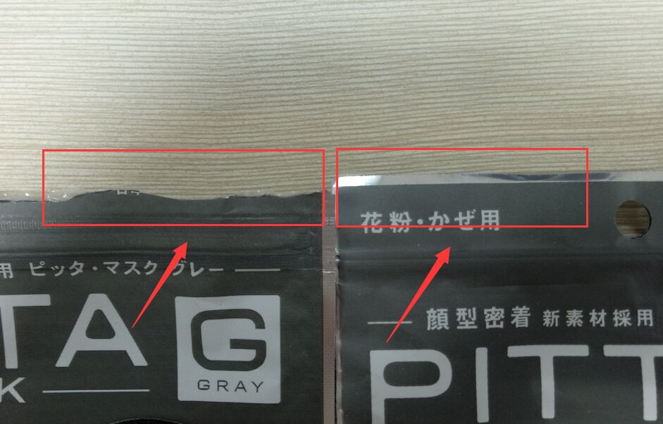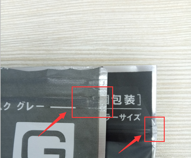 正品:所有產(chǎn)品內(nèi)包裝中間的一道熱封口和口罩耳繩折疊方向都是順向的,工字狀的熱封手感是瓦楞狀的。